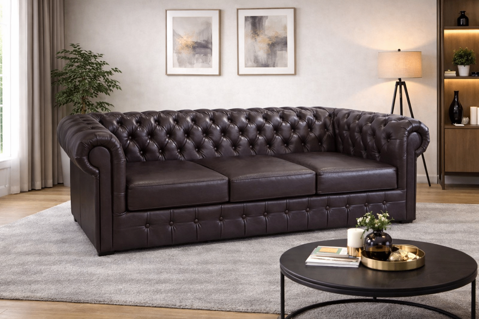 Canapea Chesterfield este o piesă de mobilier elegantă și atemporală, recunoscută pentru designul său clasic cu capitonaj tip „button tufting” și brațe rotunjite, care oferă un plus de rafinament oricărui living. Realizată pentru confort și stil, această canapea aduce o notă de eleganță britanică și devine cu ușurință punctul central al încăperii, fiind ideală atât pentru interioare clasice, cât și pentru cele moderne.