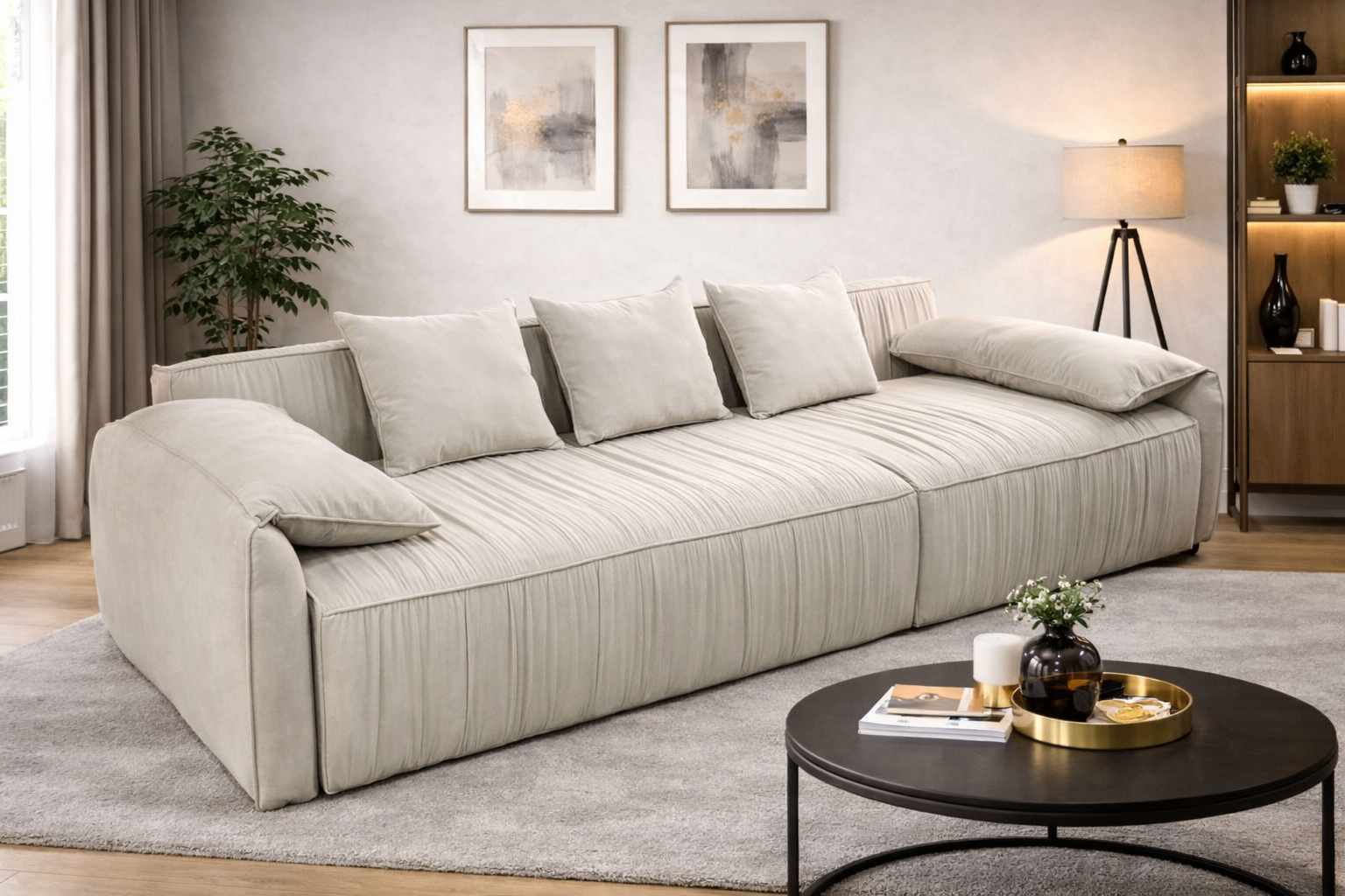 Canapea Ela impresionează prin designul său modern și liniile elegante, fiind creată pentru a oferi un nivel ridicat de confort și un aspect rafinat în orice living. Forma sa generoasă și pernele moi transformă fiecare moment de relaxare într-o experiență plăcută, iar stilul minimalist o face ușor de integrat atât în interioare moderne, cât și în cele contemporane.