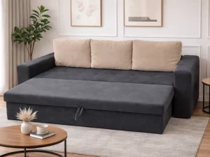 Datorită funcției de extensie generoase, canapeaua se transformă rapid într-un spațiu confortabil pentru dormit, iar lada de depozitare integrată oferă loc practic pentru lenjerii, pături sau alte obiecte utile.