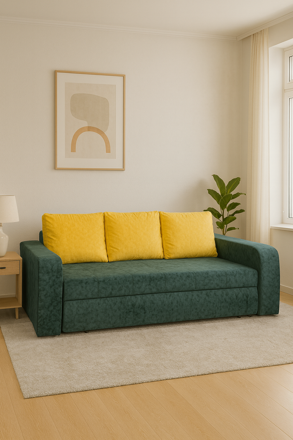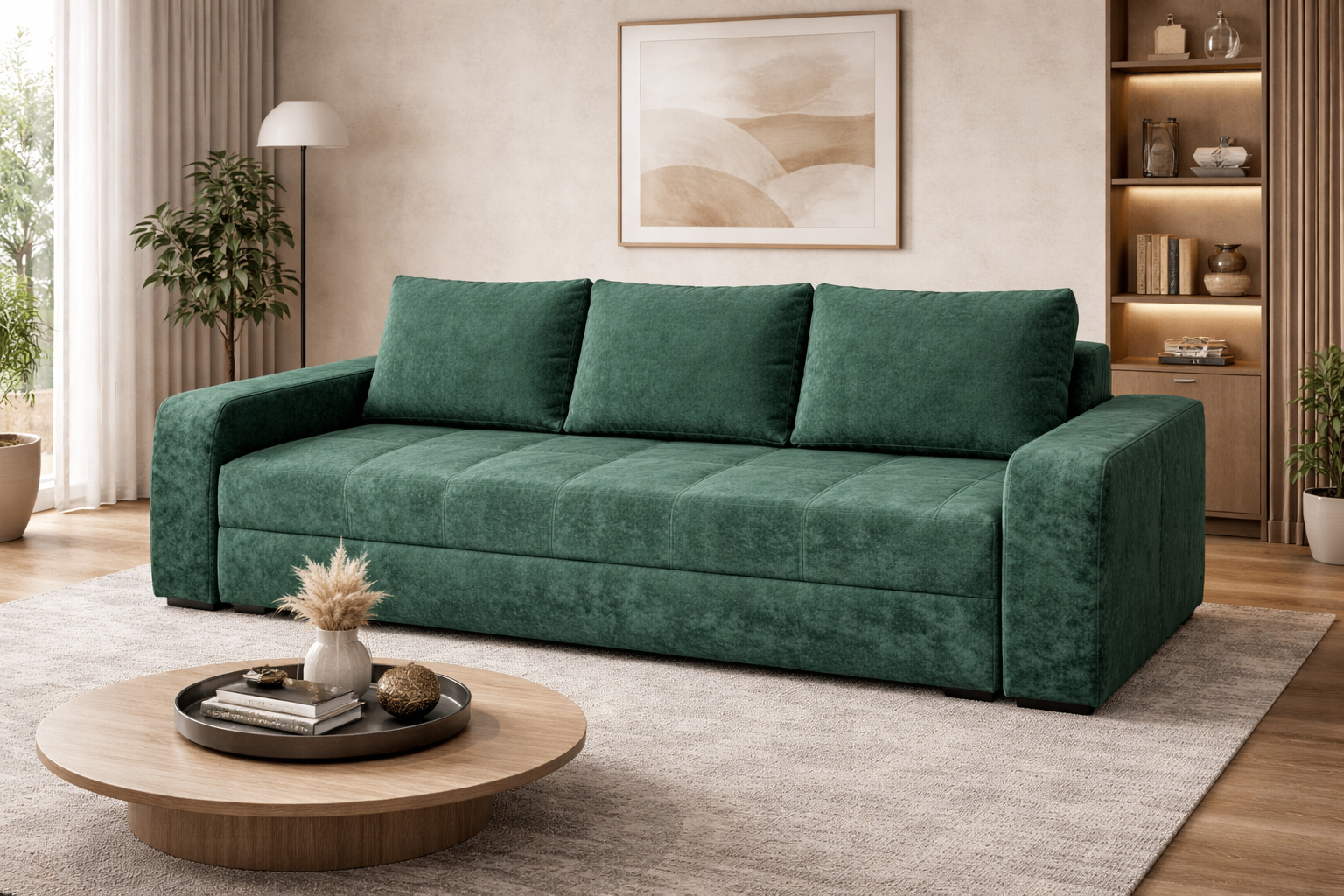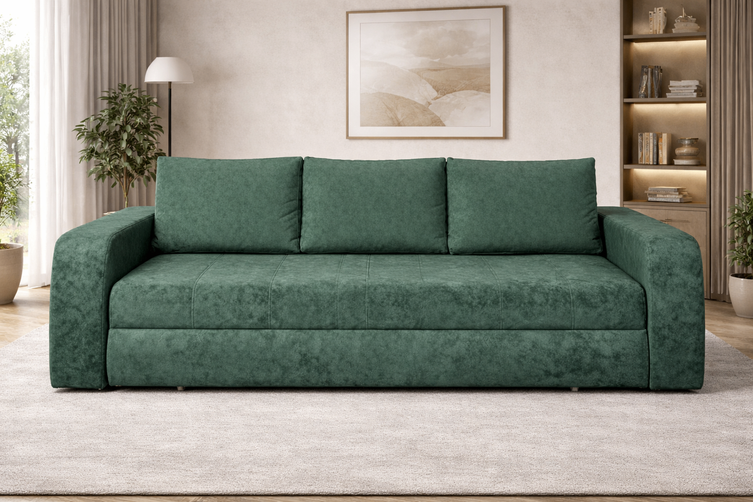 Funcția de extensie generoasă transformă rapid canapeaua într-un spațiu confortabil pentru dormit, iar lada de depozitare integrată este perfectă pentru păstrarea lenjeriei sau a altor obiecte necesare.