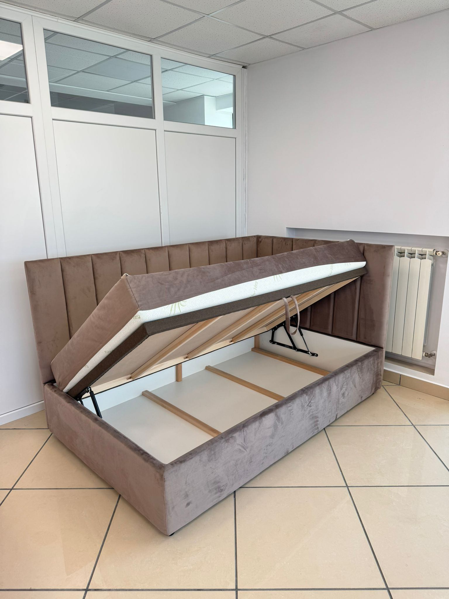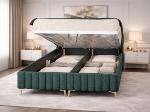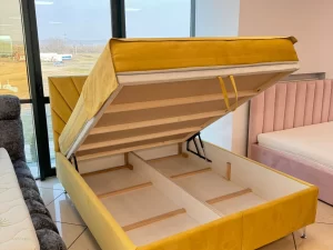 Patul este dotat cu o ladă de depozitare generoasă, ideală pentru organizarea eficientă a lenjeriei, pernelor sau altor obiecte. În plus, sistemul culisant al saltelei (sus-jos) permite acces rapid și ușor la spațiul de depozitare, fără efort.