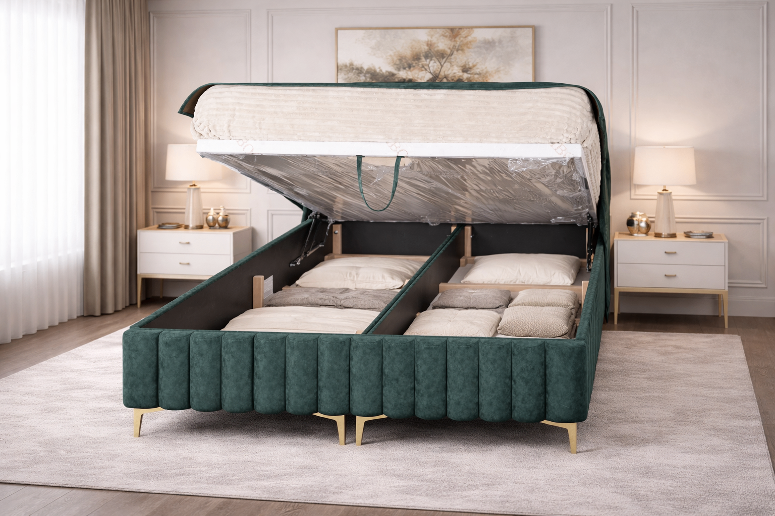 Construit pentru durabilitate și confort, patul este prevăzut cu ladă de depozitare spațioasă, perfectă pentru păstrarea lenjeriilor, pilotelor sau altor obiecte esențiale. Astfel, economisești spațiu și menții dormitorul ordonat.